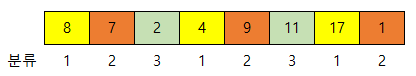 요런식으로 일정 구간을 정하여 각각의 분류(그룹)를 만들어서 해당 분류 내에서 정렬을 시킵니다.