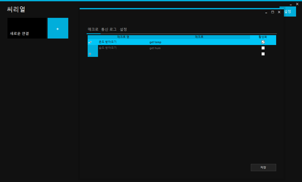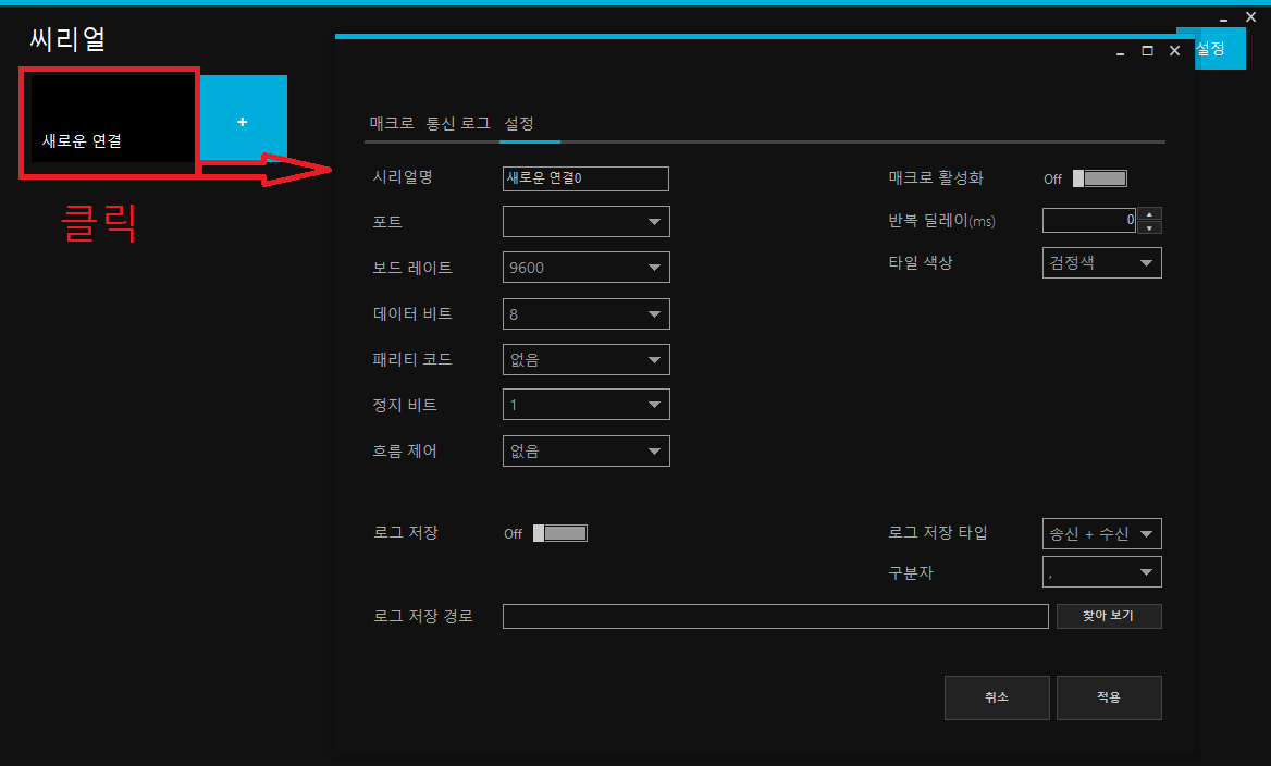 프로그램에서 [ + ] 를 누르면 시리얼 통신 객체를 하나 생성하게 됩니다.