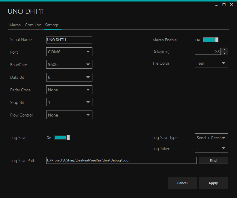 생성된 시리얼 객체를 누르면 통신관련 설정을 할 수 있습니다.
