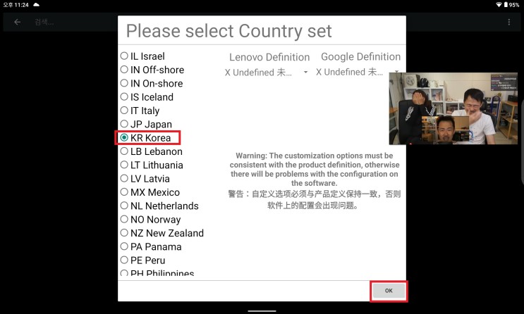"KR Korea"를 선택한 후 "OK"를 누르게 되면 공장 초기화를 시도합니다.