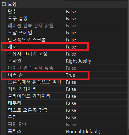 일단 속성에서는 세로(Vertical), 여러 줄(MultiLine)이 가장 많이 쓰입니다.