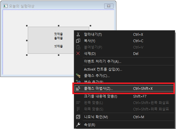 버튼을 오른쪽 클릭하여 "클래스 마법사"를 띄웁니다.