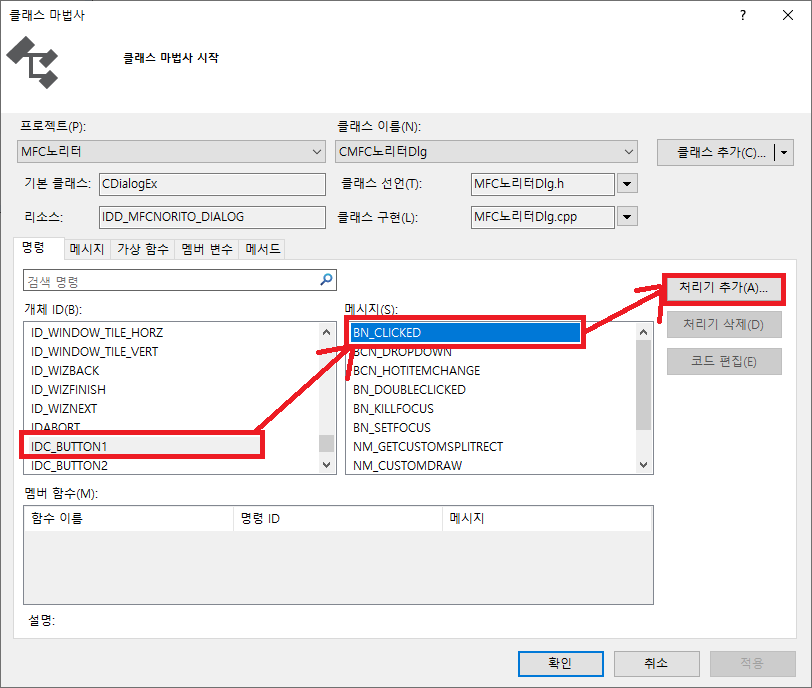 여기서 "개체 ID"에서 버튼을 찾고 "메시지"에서 BN_CLICKED를 선택하여 처리기를 추가하는 방법이 있으며