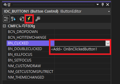 속성에서 BN_CLICKED를 눌러서 함수를 추가하는 방법이 있으며