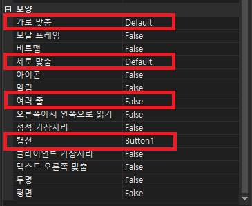 버튼 컨트롤에서 가장 많이 쓰이는 속성은 위의 4가지 입니다.