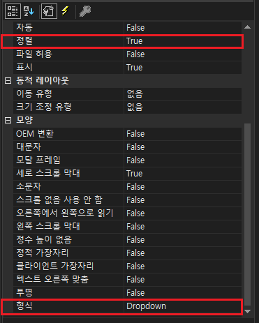 | 형식 | Type | 콤보 박스 형식 (Simple, Dropdown, Drop List) |