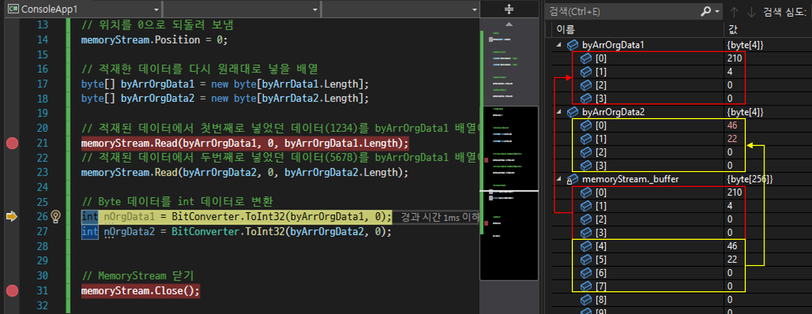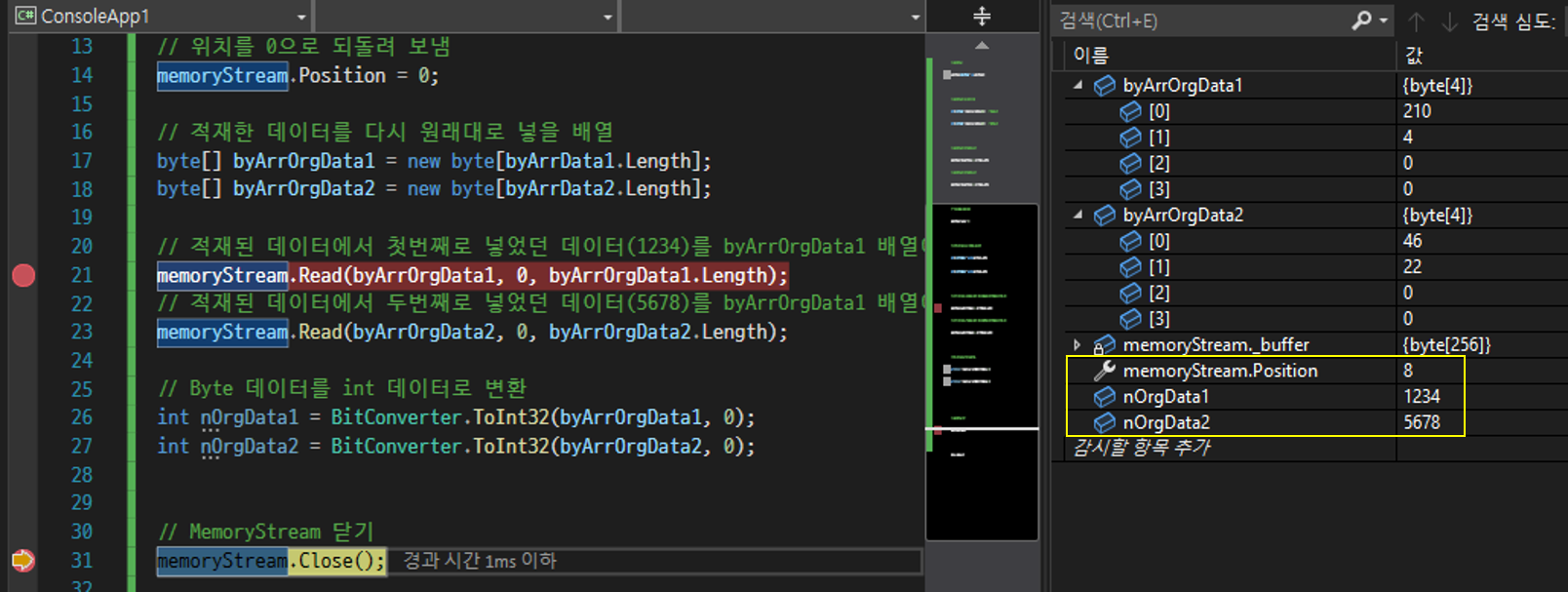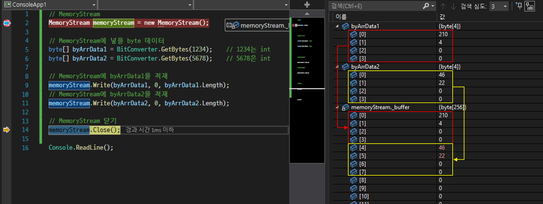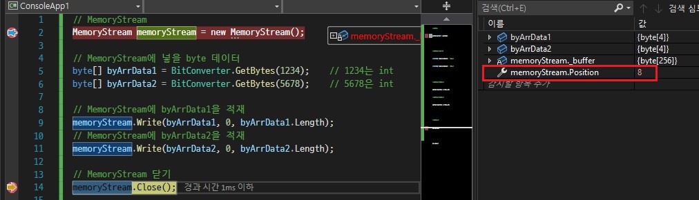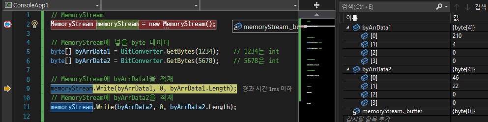 6번줄까지 실행했을 때 MemoryStream이 열렸고 byArrData1(1234)와 byArrData2(5678)이 생성되었습니다.