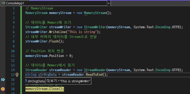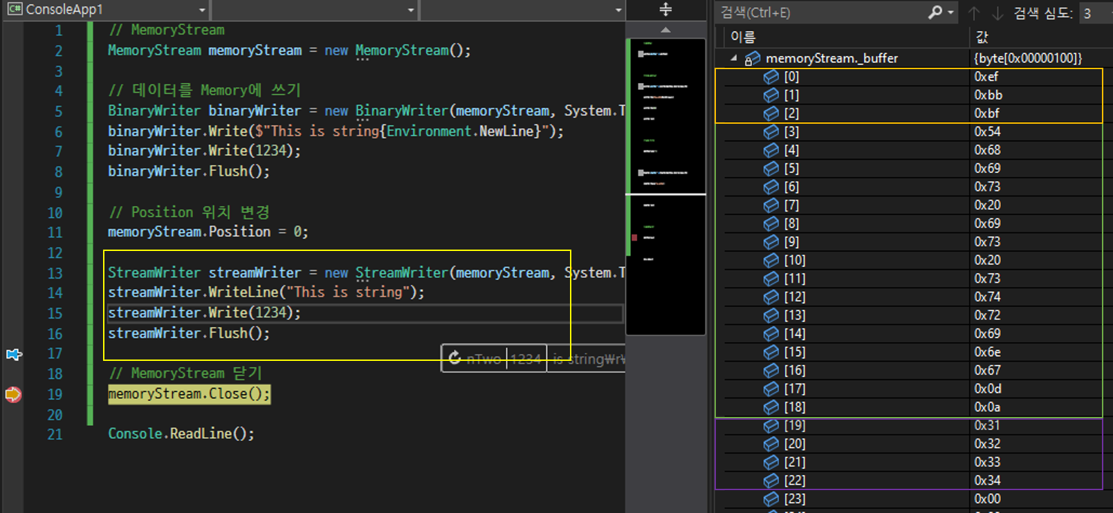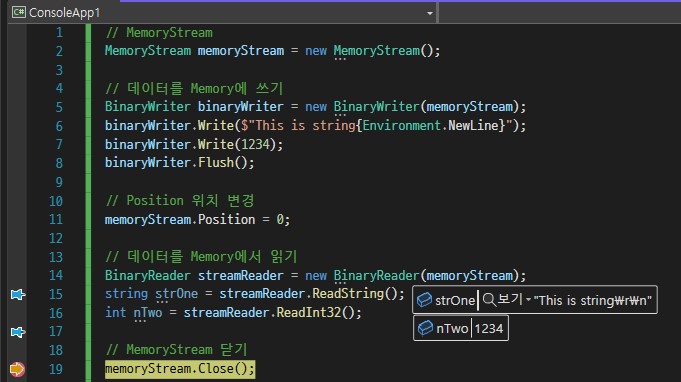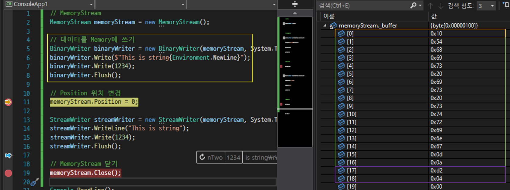 11번줄까지 실행했을 때 각각의 Byte 데이터들이 MemoryStream에 차례대로 적재가 되었습니다.