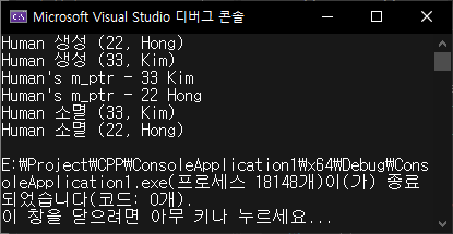 ~Human() { printf("Human 소멸 (%d, %s)\n", m_nAge, m_strName.c_str()); }