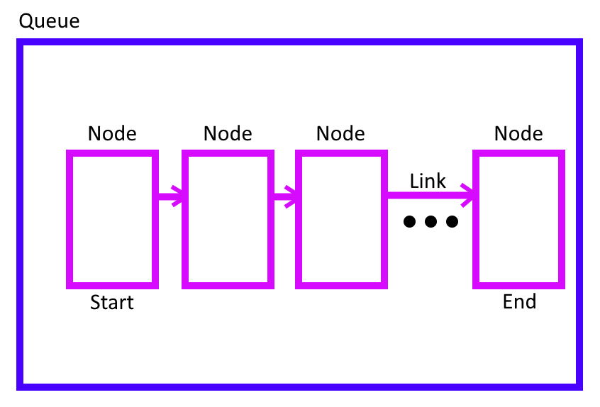 이 Node들은 단방향으로 길게 이어져 있으며 Queue는 이 Node들의 시작 지점(Start)과 끝 지점(End)을 기억하고 있습니다.