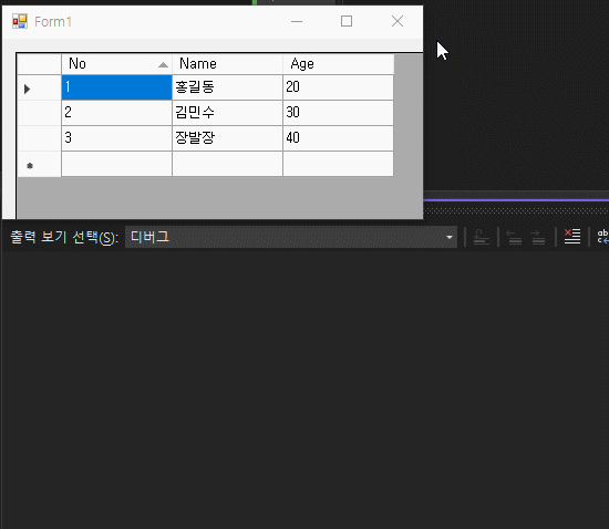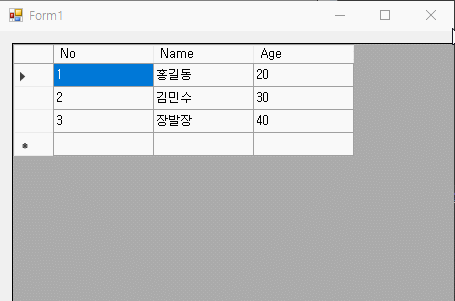 (No, Name, Age 라는 Column이 존재, 전부 DataGridViewTextBoxColumn)