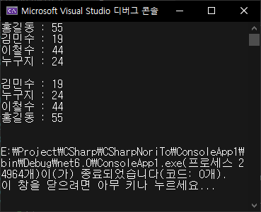 위의 코드에서 중요한 부분은 바로 Main 함수의 Array.Sort(배열) 부분입니다.