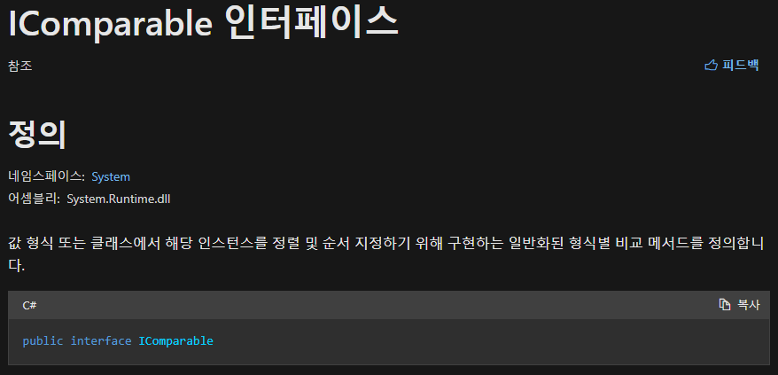 class에서 Sort 기능을 이용하여 내가 원하는 대로 Sort를 하기 위해서는 IComparable 인터페이스를 상속하여 CompareTo 함수를 정의해주어야 합니다.