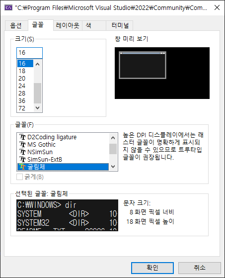 그러므로 명령 프롬프트의 폰트는 "굴림"을 사용 해주세요.