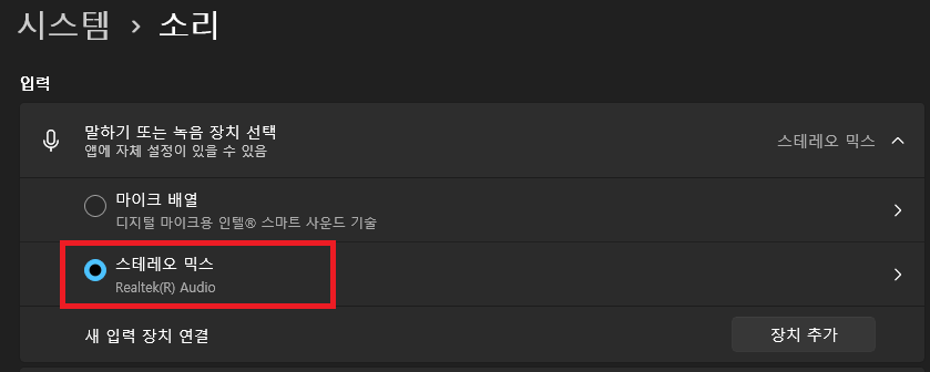 4) 윈도우 설정에서 시스템 - 소리 에서 말하기 또는 녹음 장치 선택의 항목을 스테레오 믹스로 변경
