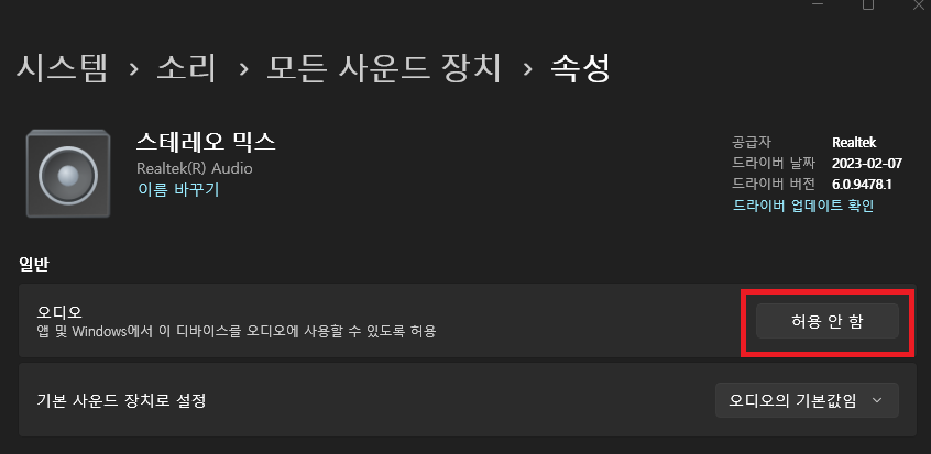 3) 윈도우 설정에서 시스템 - 소리 - 모든 사운드 장치 - 속성 에서 스테레오 믹스 항목을 허용 함을 누른다.